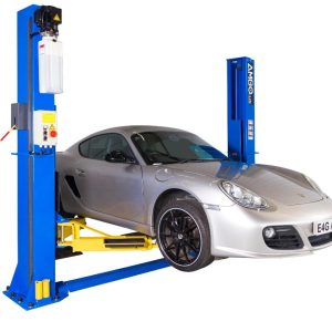 Two post lifts consist of two large columns that bolt into the concrete floor, each with two arms attached. These arms can twist back and forth and contract in and out to reach the lifting points of the vehicle. There are two main types of 2 post lifts: